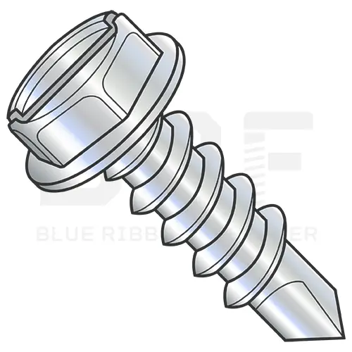 › Screws › Self-Drilling Screws › hex washer self drilling screws › slotted hex washer self drilling screws › steel zinc 7 16 af 3 pt slotted hex washer self drilling screws › 14X1 Slotted Indented Hex Washer 7/16 A/F Self Drilling Screw Full Thread Zinc & Bake